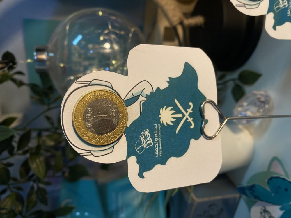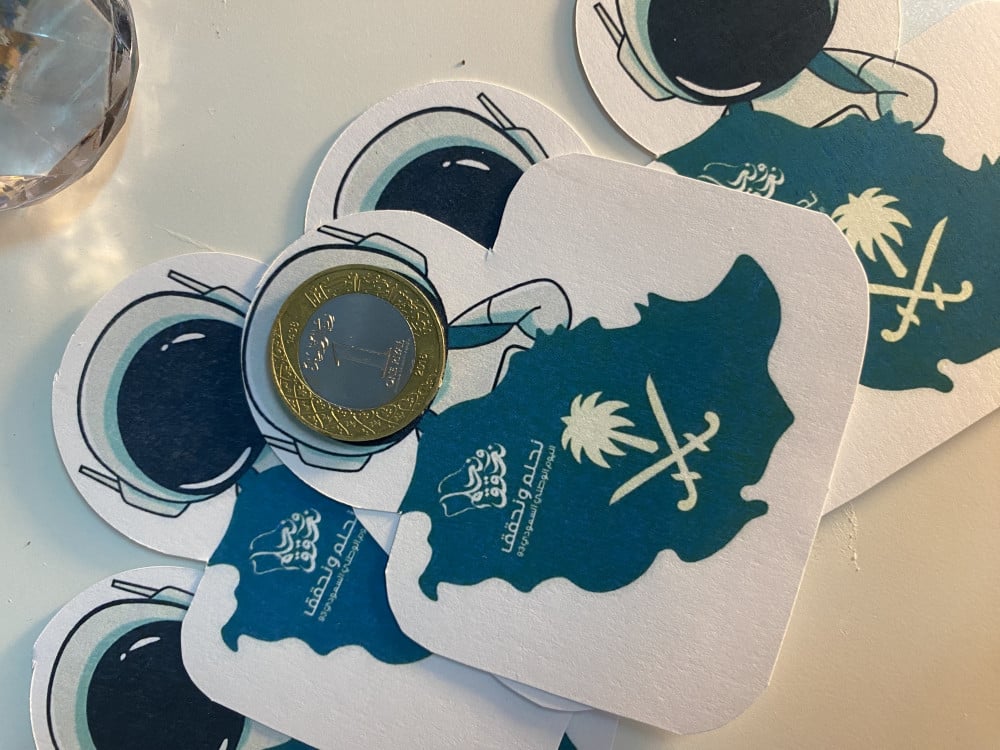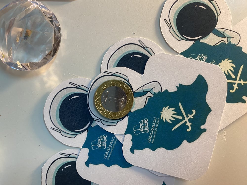 بطاقة رجل الفضاء بثيم اليوم الوطني مع إضافة ريال مع تغليف شفاف